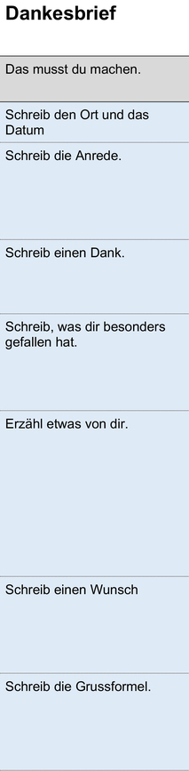 Schüler/-innen auf Niveau 6 schreiben ohne Schreibplan oder verwenden nur Titel zu Textteilen (z.B. Anrede, Dank, Besonderheit…) und ergänzen diese mit eigenen Teilthemen. Sie können dabei den Schreibplan zum Nachschauen verwenden.
