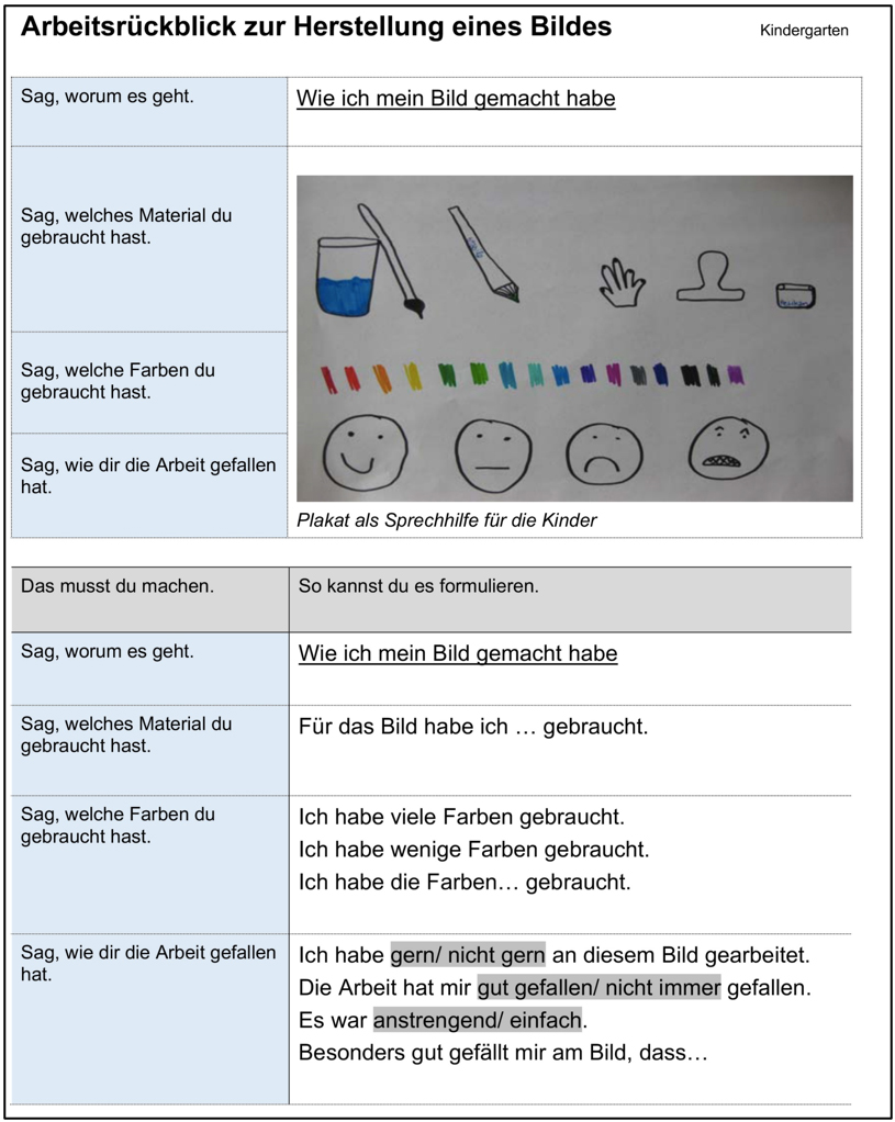 Auf der Kindergartenstufe werden als Erinnerungsstütze für den «Textaufbau» beispielsweise Bilder, Symbole oder Plakate (siehe Beispiel «Arbeitsrückblick zur Herstellung eines Bildes») verwendet. Die Formulierungsvorschläge und ein allfälliger Mustertext dienen der Lehrperson für die Lernbegleitung.