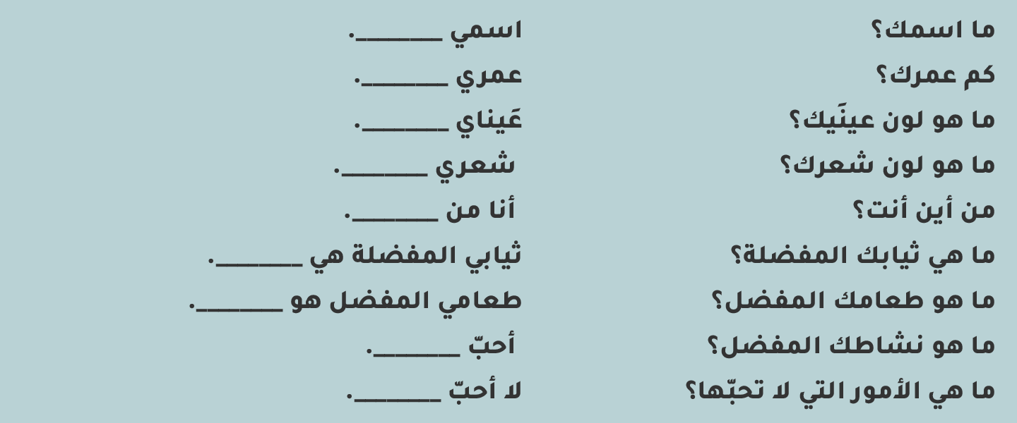 مرحبًا. اسمي باولو وعمري 17 سنة. لون عَيناي خضراوان وشعري بُنّي. أنا من إيطاليا. ثيابي المفضلة هي سراويل الجينز والقمصان الرياضية. طعامي المفضل هو المعكرونة. أحبّ التمارين الرياضية. لا أحبّ العنف.