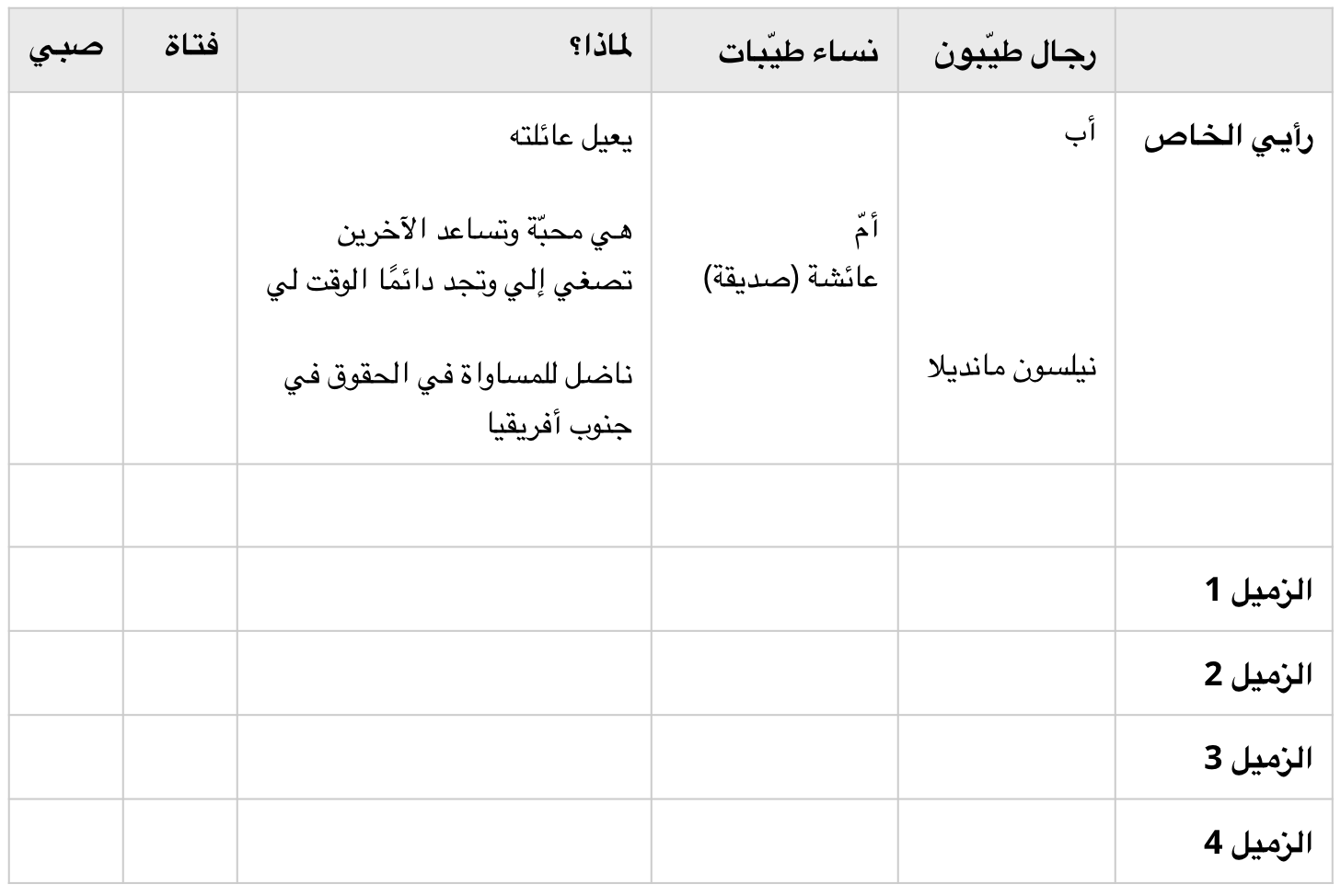 أنظر إلى المثل أدناه واملأ الخصائص الشخصية للأشخاص الذين اخترتهم في الجدول الذي رسمته. يمكنك رسمها أيضًا.