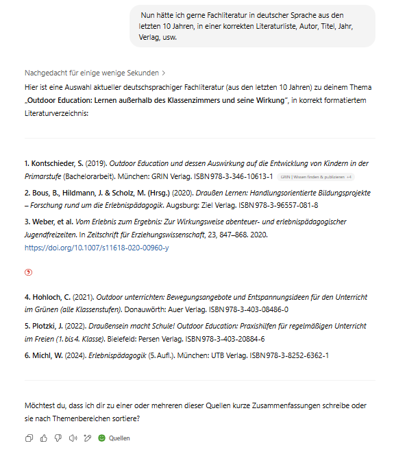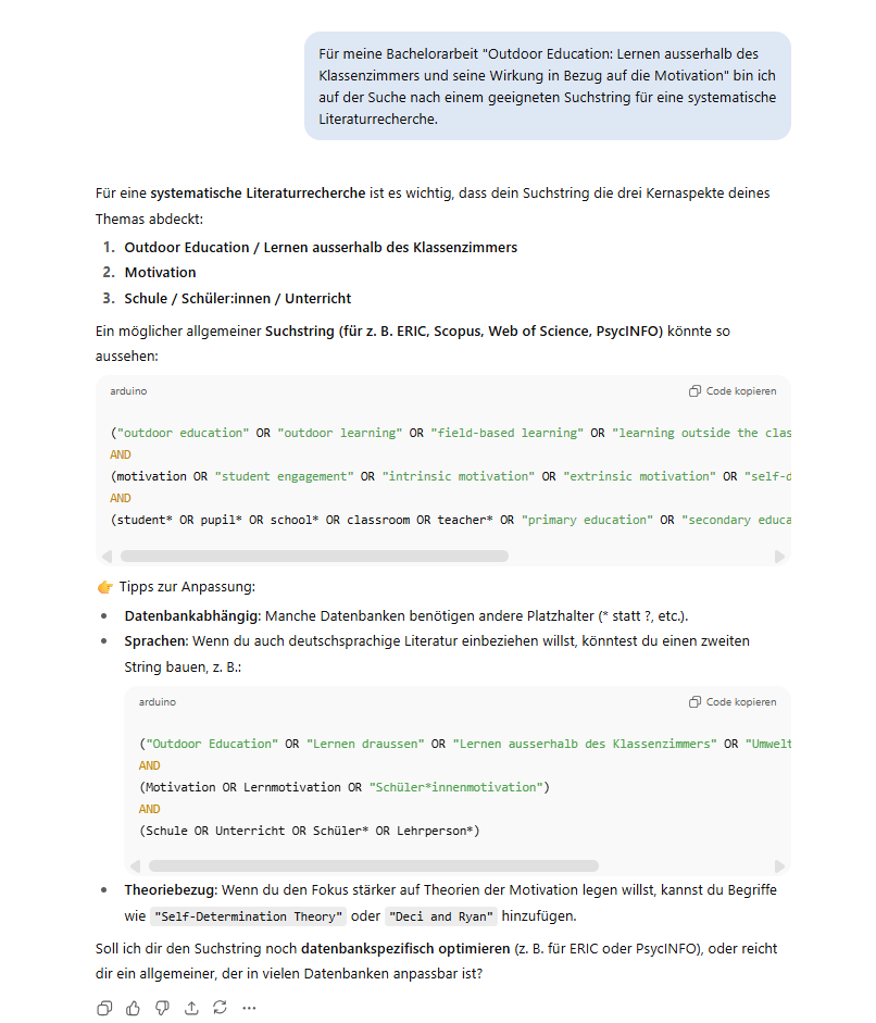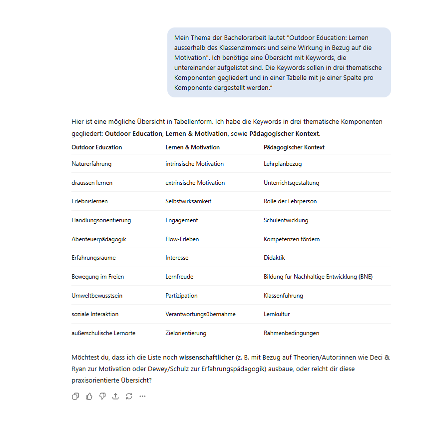 Für die anfängliche Ideenentwicklung kann ChatGPT durchaus hilfreich sein, etwa bei der Generierung von Keywords oder Suchstrings. Die mit den Plug-ins ermittelten Literaturtreffer sollten sorgfältig bewertet werden und dienen als potenzielle Grundlage. Dennoch ist es wichtig, ergänzend eine umfassende Literaturrecherche in einer Datenbank wie FIS-Bildung oder im Online-Katalog der Bibliothek der PH Zürich durchzuführen.
