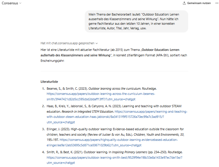 Wenn deutschsprachige Literatur benötigt wird, sollte der Prompt entsprechend modifiziert werden. Schon auf den ersten Blick fällt auf, dass die bereitgestellte Liste wesentlich kürzer ist und Verlinkungen zu Consensus fehlen. Die Datenbasis ist überwiegend auf englischsprachige Fachliteratur ausgerichtet.