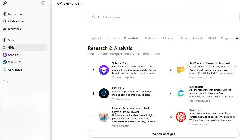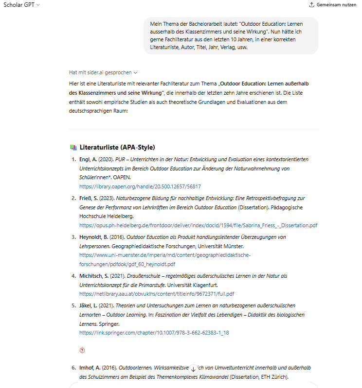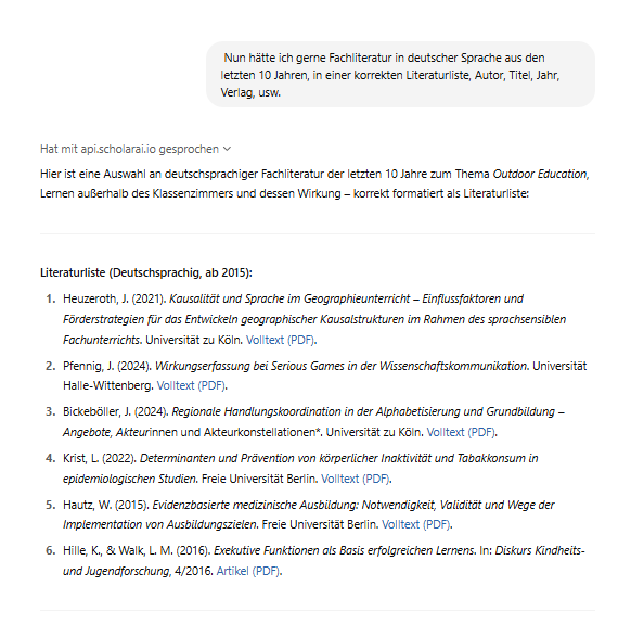 Scholar GPT liegt unter anderem die Datenstruktur von Google Scholar, PubMed, bioRxiv und arXiv zugrunde. Auch bei diesem Plug-in ist es nützlich, den Prompt so präzise wie möglich zu formulieren. Scholar GPT erstellt ohne Aufforderung eine Liste mit deutschsprachiger Fachliteratur. Die Verlinkungen führen entweder zu Verlagsplattformen oder öffnen direkt das PDF.