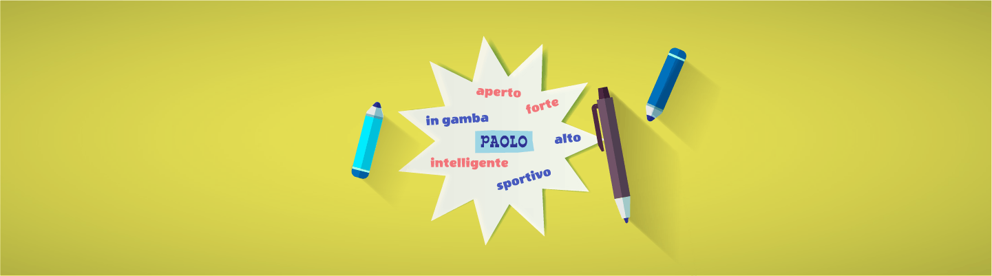 Guarda la stella disegnata da Paolo. Lui ha scritto il suo nome nel centro della stella. Poi ha aggiunto alcuni aggettivi.