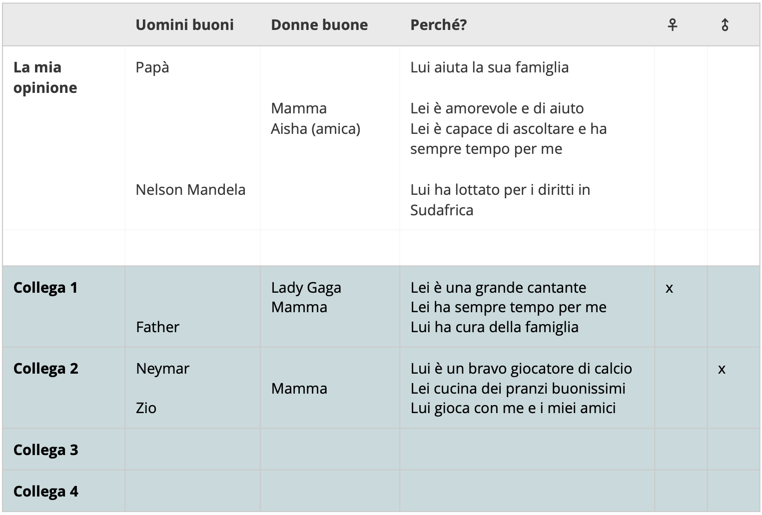 - Ricorda di aggiungere il motivo per cui i tuoi compagni e le tue compagne hanno scelto i loro uomini buoni e le loro donne buone. Segna con una x i «maschi» o le «femmine».