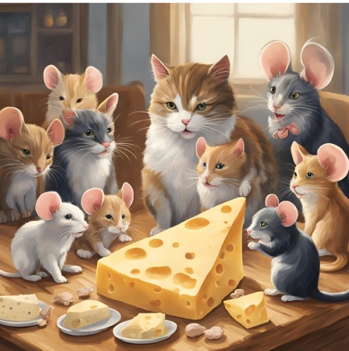 Canva: A cute cat speaking seriously to a bunch of mice asking them to please stop eating all the cheese