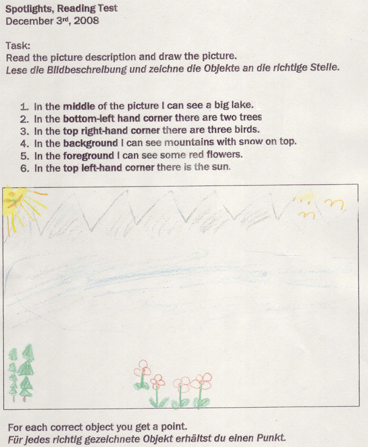 - Because this is a test and the children shouldn't have to spend time decoding and understanding the instructions, you might use German. This is disputed - some studies show it's a good thing, others show it makes no difference in performance. If you leave it in English, you can consider giving points for the construct "understanding instructions" and you then might consider giving points for "understanding words" and then you have two constructs. However, this is a prerequisite for doing the rest, so it is a problem. However, you should ask yourself if this test is worth all that effort or if you can use it as a worksheet and observe those two constructs.