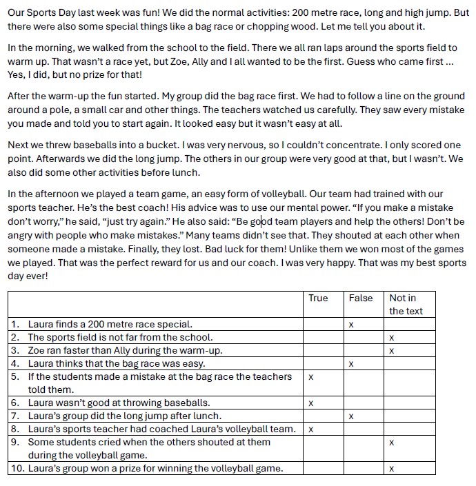 In this example (originally from Lernkontrollen zu Young World 3, Klasse 5, 2010), think about the following questions: