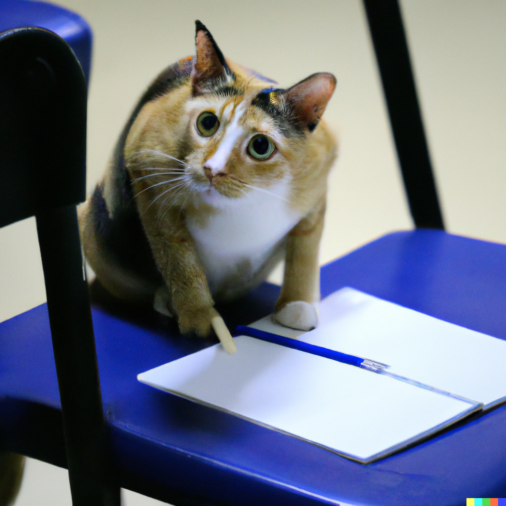 from DallE: a cute cat taking notes in class