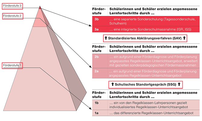 3. Das Konzept der Förderstufen strukturiert die Unterstützung des Kompetenzerwerbs. Drei Förderstufen schaffen die Voraussetzungen, dass möglichst alle Schülerinnen und Schüler ihre Kompetenzen optimal entwickeln können und die Grundansprüche erreichen. Die Fördermassnahmen reichen von Individualisierung (Förderstufe 1), über Förderdiagnose und entsprechende Massnahmen (Förderstufe 2) bis zur separierten Sonderschulung (Förderstufe 3), wie in nachfolgender Grafik dargestellt. Hinweis ![]() Förderstufenmodel (Broschüre Umsetzung des Zürcher Lehrplans 21 für Schülerinnen und Schüler mit besonderen pädagogischen Bedürfnissen, Seite 15) 4. Kompetenzorientierte Förderung ist eine gemeinsame Aufgabe. Im Lehrplan gibt es sechs Fachbereiche und zwei Module mit verschiedenen Kompetenzbereichen, in denen für drei Zyklen Kompetenzen beschrieben werden. Wie kann da der Überblick behalten werden, wenn der Lernstand der einzelnen Schülerinnen und Schüler berücksichtigt werden soll? Weitere Informationen zur Ausgestaltung der Angebote in den Schulgemeinden finden Sie in der Broschüre Broschüre Umsetzung des Zürcher Lehrplans 21 für Schülerinnen und Schüler mit besonderen pädagogischen Bedürfnissen (vgl. 16ff). Hinweis |