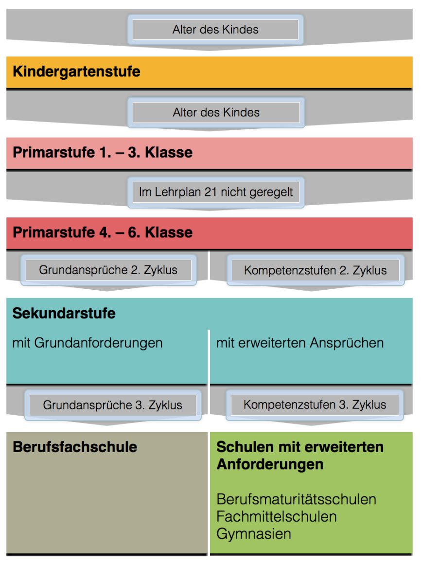 ![]() | ÜbergängeWie Sie bereits wissen, unterteilt der Lehrplan 21 die Volksschulzeit in drei Zyklen, für die er jeweils Grundansprüche definiert. In der Schulpraxis wird jedoch nach wie vor nach Stufen unterrichtet. Wie regelt der Lehrplan 21 die Übergänge zwischen den verschiedenen Schulstufen der Volkschule und wie den Übergang zur Sek II?Aufgabe 7 Übergänge Kriterien zuordnen